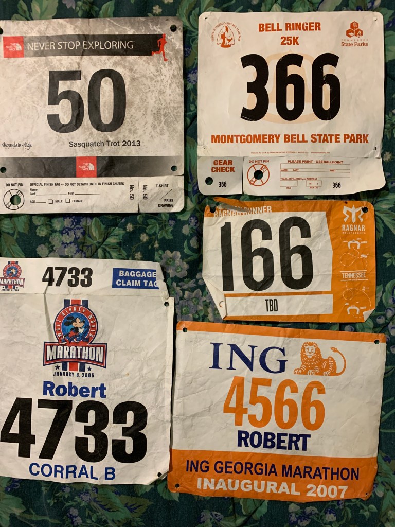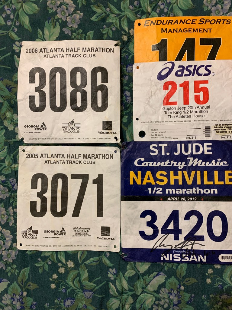 Since 2005, I have even ran in a several half marathons. I am only showing 5 bibs, but I am sure there are more. With 2 bibs from a Thanksgiving day tradition in Atlanta. A bib autographed by Ryan Hall and my fastest half marathon at 1 hour 39 minutes in Nashville.
