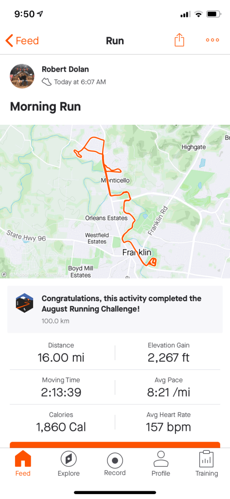 Sunday’s run was a repeat of the previous week in that I went to Preservation Park and hit the trails again. I managed to squeak out 7.0 miles and I know my pace was impacted by the 92 degree heat and a couple of stops. One due to a snake on the path and another stop for a dog off the leash that came at me.