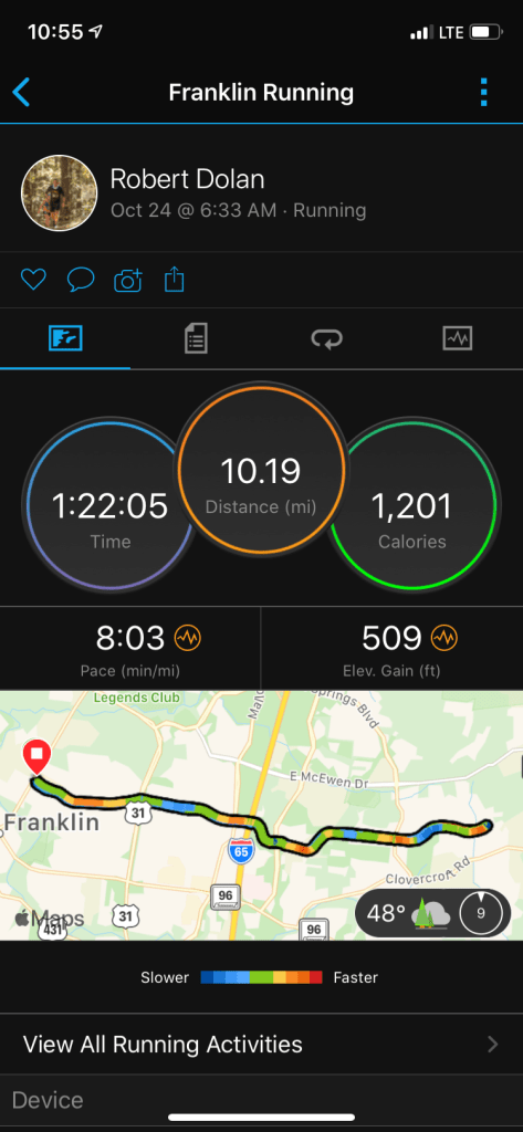 Debated running later on Saturday, but was convinced to run with the Franklin Road Runners at the Factory in Franklin at 6:30am. Great 10 mile run with Bill and Alison. Great turn out of an addition 15 runners at different paces and distances.