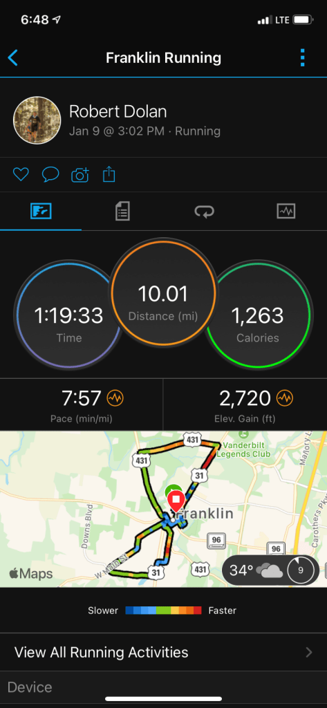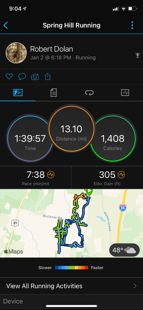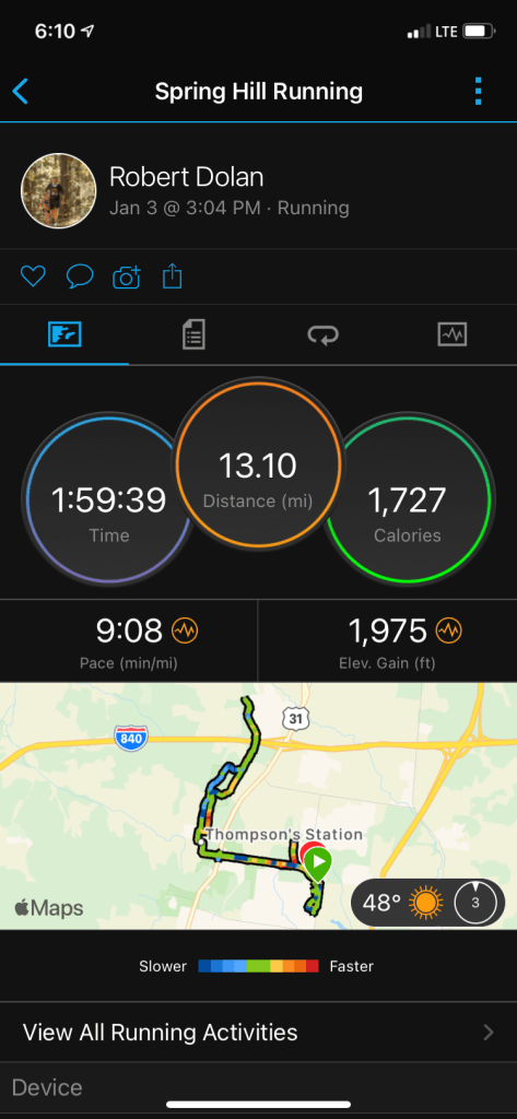 So, starting on January 2nd, a Saturday I was able to get my first run in and I opted for a half marathon. Crazy thing about the run was that I was 7 seconds off my PR. That is not even a second per mile. I actually decided to just run through the neighborhoods and would of thought the elevation would have been more. Sometimes hitting every cul-de-sac can be difficult.