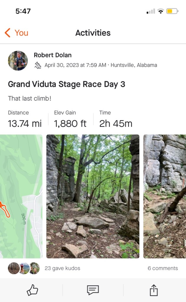 The Grand Viduta Stage Race took place at the end of April 2023 and was an amazing adventure over three days with over 40 miles covered and 4,600 feet of elevation climbed. The race took place near Huntsville, Alabama in the Monte Sano State Park. This was the tenth and final time for the event. @RunningLaneEvents did an amazing job providing support for all the runners.