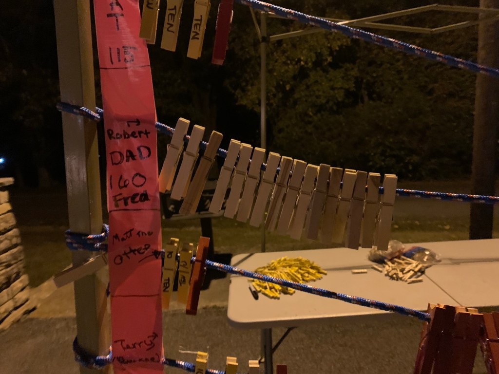 Everyone started together and about 50 of us headed toward the trail. We had 5k, 10k, half marathon, marathon and 50k all with us. Based on where I landed in the group, my first loop was almost my slowest. As we ran, I typed directions into my phone with landmarks so I would not get lost. The Scalawags set up a tent between the trail and aid station, so I had a place to refuel or stop between laps. After you finished a trail loop, you grabbed a clothes pin, ran to the aid station, and pinned it to your clothes line. Each time I finished a loop, I got to see my daughter administering first aid to someone that had chaffing, or bee stings, blisters or right muscles. I tried to high five her each lap and keep going. At the very beginning of the race she did send a group text out stating I had 10 1/2 hours to go. . .