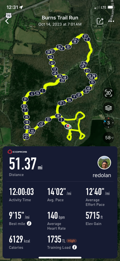I ran the Mo’ Bell 12 hour race October 14th, 2023 with a goal of reaching 50 miles.