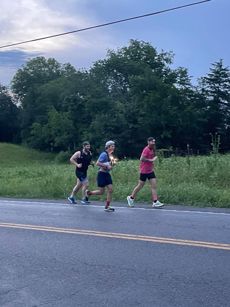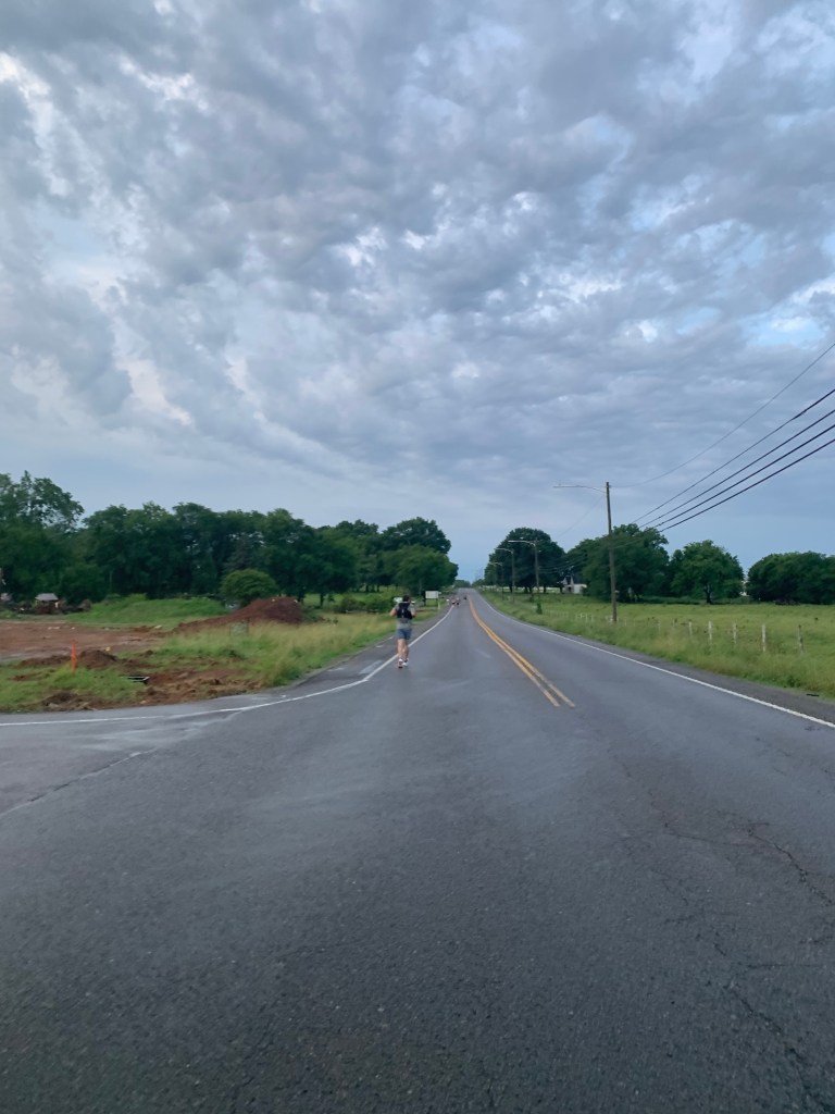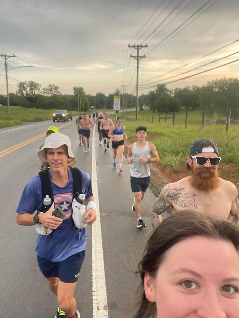 We started at 5am north of Chapel Hill after the national anthem was sung and lined up behind three men from the military. They stayed up front for the majority of the ultra.