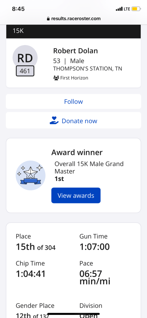 This was my fastest road 15k in quite awhile and good enough to place as the overall male grandmaster m.